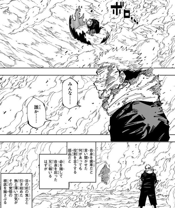 脹相は死に、脹相が作った血の壁がなくなると辺りは焦土と化していました。虎杖は自分を歯車だと言い聞かせて役割を全うしようとし、命を賭して自身を庇った脹相にも報いるはずでしたが、目の前の焦土と引き始めた熱と薄い空気が、虎杖の覚悟の根底を揺さぶります。虎杖は生き残りの仲間が誰かいないか探しますが、煙の間から現れたのは宿儺でした。