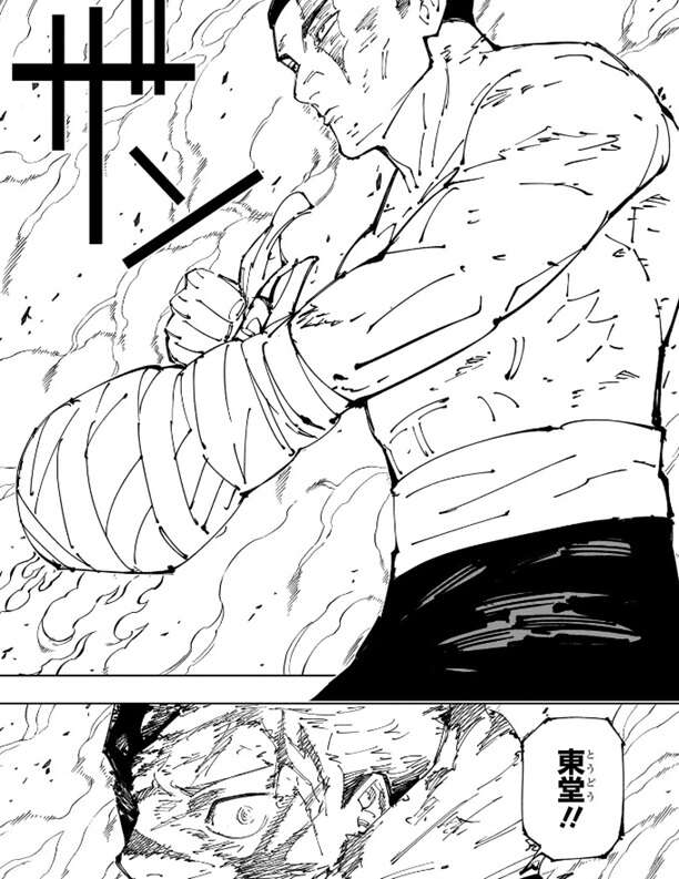 宿儺に対して臨戦態勢を取ろうとする虎杖ですが、煙の間からさらに別の人影が現れます。その人影の正体は東堂葵でした。ただ、東堂の左腕には包帯が厚く巻かれていました。東堂は新宿決戦前の話し合いの場に参加していませんでしたが、その理由が明かされます。