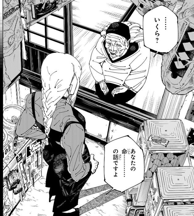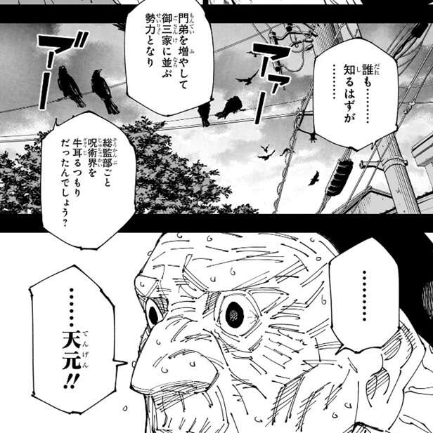 門弟から寿命を吸い上げてまで見たい景色があったんでしょう?まさに金には替えられない大きな野望だ、そして今禪院家が壊滅し、今回の決戦で加茂家と五条家が共倒れすれば……、と冥冥は当主が門弟から寿命を吸い上げてまで叶えたかった野望を代弁します。しかし、お金より大事な物はお金がないと守れないと冥冥は言い、「簡易領域」の独占がなければ死なずに済んだ術師もいたでしょう、と言うと当主は恐怖のあまり顔面から汗を拭きだします。