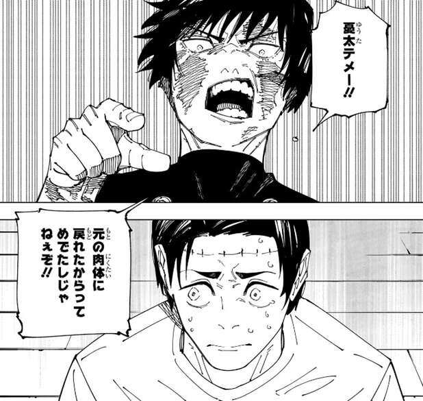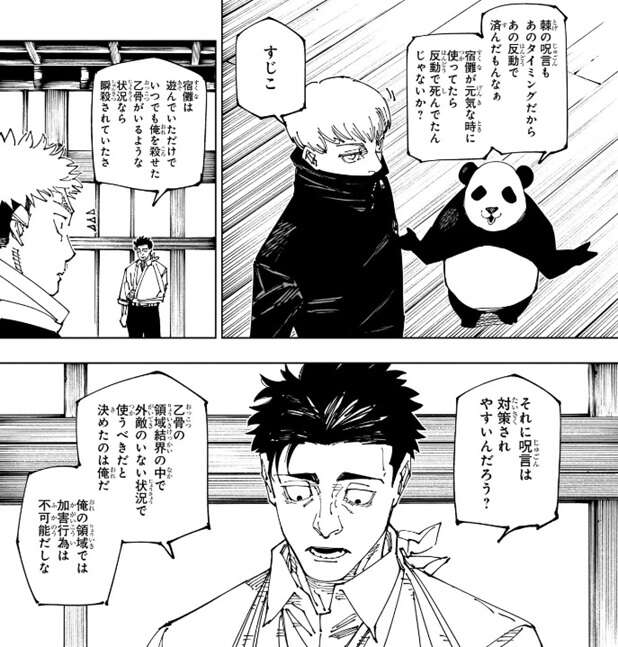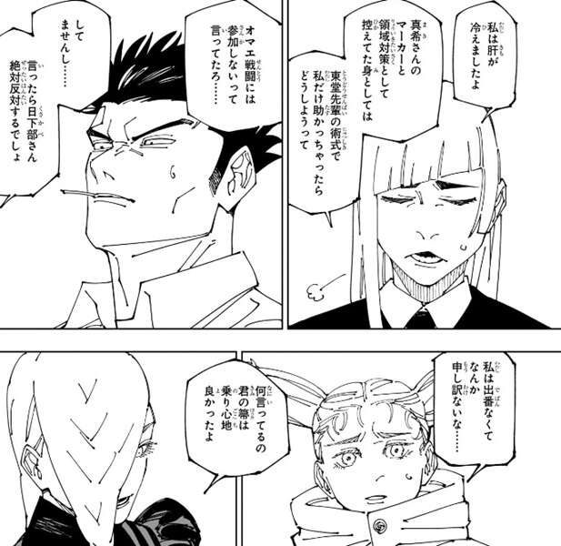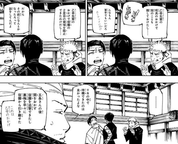 狗巻とパンダも真希の意見には否定的で、もし宿儺が元気な時に狗巻のボイスレコーダーを使っていたら狗巻は反動で死んでたんじゃないか?と言います。さらにここで日車が登場、日車は生き残っていました。日車も宿儺は自分に対して遊んでいただけでいつでも殺せた、乙骨がいるような状況なら瞬殺されていたさ、と言います。さらに呪言は対策されやすいので、乙骨の領域結界の中で外敵のいない状況で使うべきと決めたのは俺だ、と言います。日下部は、それでも術師を始めて2か月かそこらの奴が生き残ってんだから末恐ろしい、と日車を褒めますが、生き残ってしまったと言うべきだろうな、と日車は複雑そうな表情をします。虎杖も何か言いたげな表情をしますが、ここで真希があの助っ人外国人(ラルゥとミゲルの事)が初めからいたら、話は変わったろ!!と言うと、乙骨以外の全員が納得します。乙骨は、あの二人は来ないって言ってたんだよ!!ちゃんともしかしたらって言ったよね!?と、言い訳しますが、真希は納得しません。
