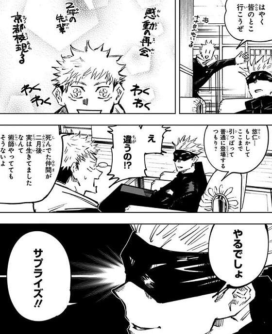 真人達、呪霊の集団は夏油と組んで宿儺の指を集め、宿儺に献上することを決め、まずは高専に保有されている6本の宿儺の指を回収する事を企てます。一方、事件が収束し虎杖は交流会の前に、皆と合流して自分が生きている事を伏黒達に明かそうとします。しかし、五条からサプライズをやるべきと言われ、虎杖は交流会当日に飛び入り参加をすることになります。