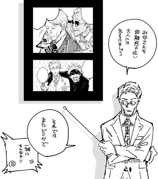 七海は距離感の近い人にはいい印象がないようで、具体例を挙げて「みなさんも距離感の近い大人には気をつけましょう」と注意しています。しかし、七海の回想の中で出てきた一般証券会社の上司と五条を同じように扱っていたので、一緒にすんなと五条が怒っています。
