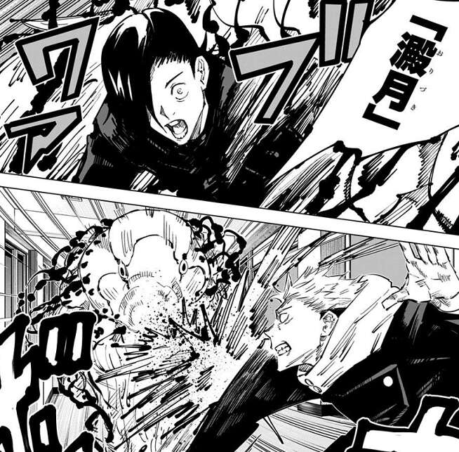 京都姉妹校交流会 団体戦が始まると、京都校の東堂はいきなり一人で東京の集団の中に突っ込んできます。虎杖は藤堂を足止めする作戦に従って顔面にひざ蹴りを入れますが、東堂には全く効かず、その後東堂から一方的に痛めつけられてしまいます。
