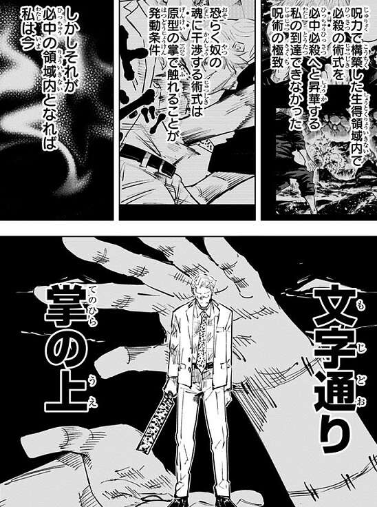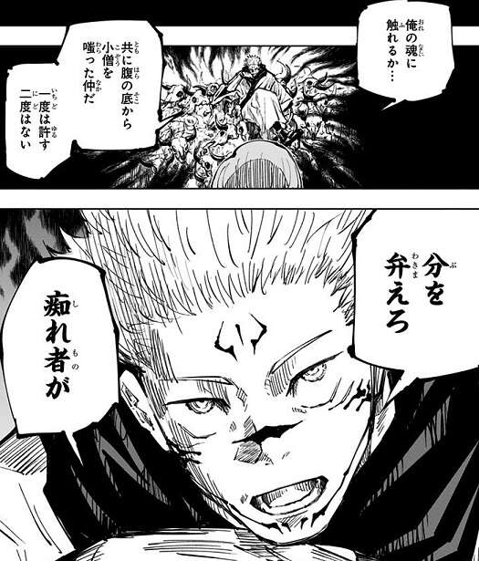 吉野が改心し虎杖と一緒に戦う決心をした直後、真人が現れ吉野を「無為転変(むいてんぺん)」で改造人間に変えてしまいます。真人は改造人間となった吉野を虎杖と戦わせ、虎杖の心を追い詰めようとします。虎杖は自分の中の宿儺に、吉野を治してくれ、と頼みますが、宿儺は虎杖の願いを断り、自分に縋ってくる虎杖をあざけ笑います。