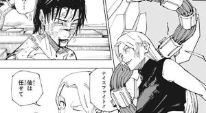 七海が合流し、虎杖と七海は共闘して真人を祓おうとします。一方、真人は改造人間のストックを出して虎杖と戦わせ二人を分断し、先に七海を殺そうとします。虎杖は化け物じみた姿になったとはいえ、元人間を殺せずに苦悩します。