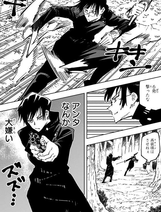 真希と真依は一対一で戦うことになり、真希は三輪から奪った刀を使って真依に近づこうとしますが、真依は銃で応戦し距離をおこうとします。真依は銃に装てんした6発の銃弾を全て撃ち、それを確認した真希はリロードされる前に決着を付けようとします。しかし、銃弾を6発全て撃ったのはブラフで、真依は自身の術式「構築術式」で銃弾を一発作り出し、真希に向けて放ちますが、真希は素手で銃弾を受け止めます。