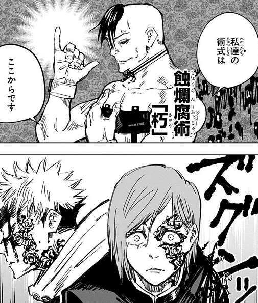 虎杖は釘崎を抱えて走り一旦は極ノ番「翅王」から逃げ切りますが、逃げた先で虎杖は血塗の血を浴び、釘崎も極ノ番「翅王」をくらってしまいます。さらに壊相の術式が発動し、二人は攻撃をくらったところから腐食が始まってしまいます。2人は持って10分~15分以内に限界を迎えると言われるほど追い込まれますが、釘崎の術式・芻霊呪法とは相性が最悪で、壊相・血塗も追い込まれる形になってしまいます。