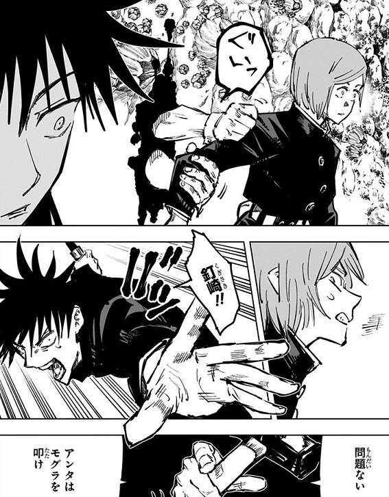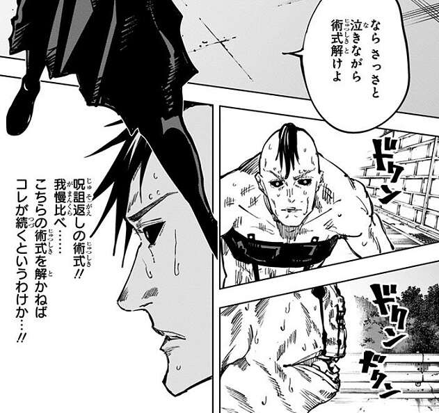 釘崎は「共鳴り」を自身に打ち込み、蝕爛腐術によって出来た強い繋がりを利用して壊相・血塗にダメージを与えます。さらに毒に耐性のある虎杖は、毒や痛みを無視して血塗に殴りかかります。虎杖のパンチの連撃をくらった血塗は重傷を負い、重傷を負った血塗を助けるため壊相は術式を解除して釘崎を攻撃しようとします。