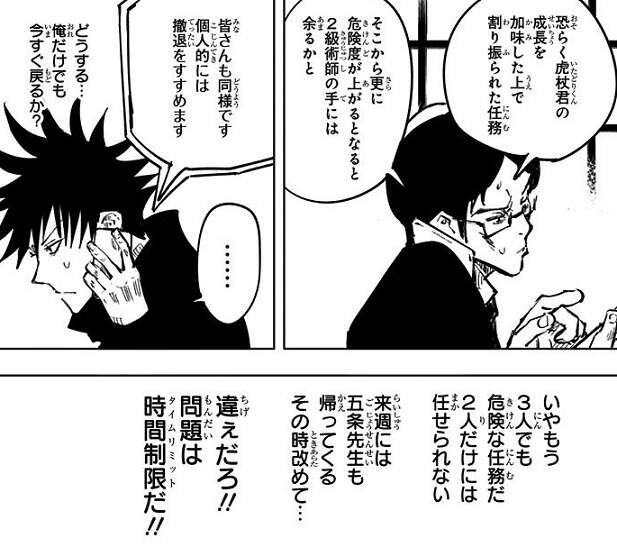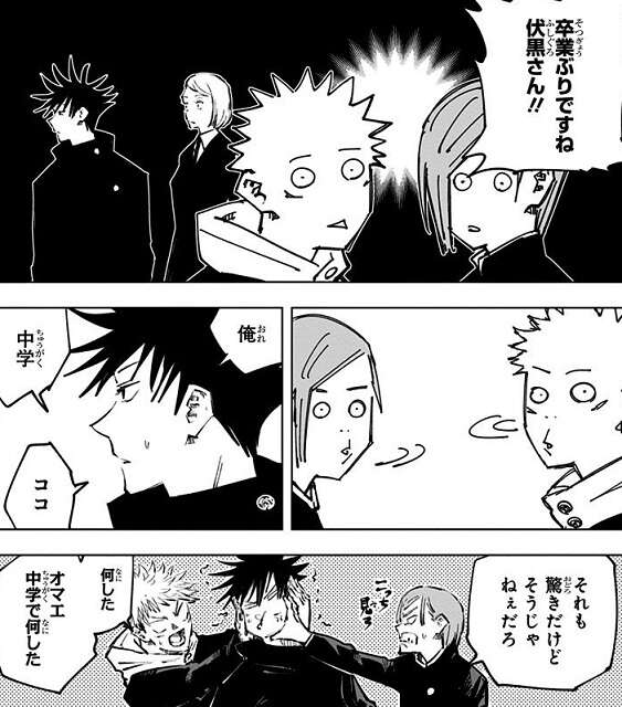 6月から8月にかけて、オートロックの自動ドアが開きっぱなしになる現象の後、呪霊による刺殺が3件続けて起こります。虎杖達は術師視点で色々探って欲しいと、3件の被害者の共通の知人の家を訪れますが、その知人も同じ現象が起きた後、呪霊に刺殺されてしまいます。仕方なく3件の被害者が卒業した中学を訪れますが、伏黒もその中学の卒業生でした。