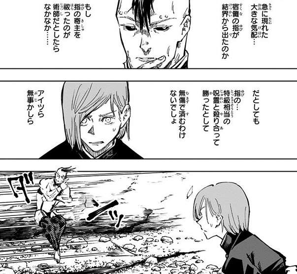 特級呪霊を倒した伏黒は結界を出たところで、安心して入眠してしまいます。一方、宿儺の指が結界から出た気配を壊相は感じ、釘崎には構わず宿儺の指を回収しに行こうとします。そこに虎杖と血塗が現れ、壊相のコンプレックスである背中を見てしまいます。コンプレックスである背中の不気味な顔を見られた壊相は激怒し、蝕爛腐術 極ノ番「翅王」を使って釘崎と虎杖を攻撃し始めます。