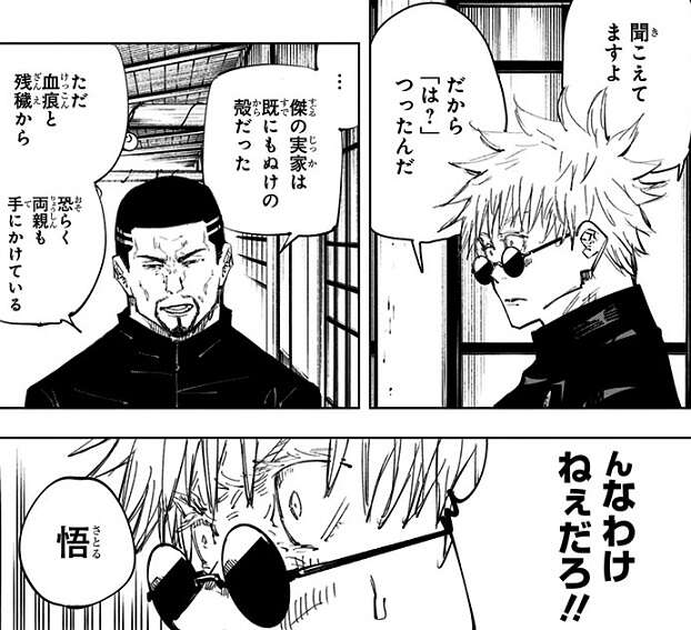 派遣された旧■■村の集落の住人112名を皆殺しにした夏油は、呪詛師として呪術界から追われる身となってしまいます。五条は夜蛾正道から事件の事を聞きますが、夏油が事件を起こしたと信じられず混乱します。