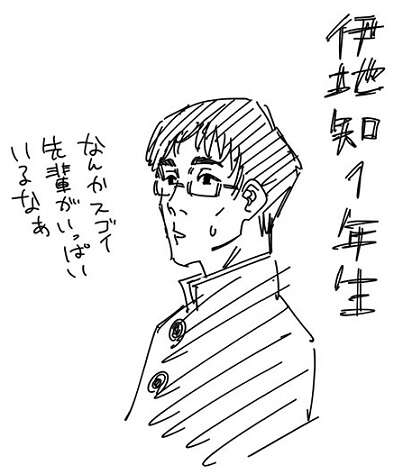 高専1年生の頃の伊地知です。2つ上の先輩に五条、夏油、家入がいて、1つ上の先輩に七海、灰原がいるので、なんかスゴイ先輩がいると圧倒されているようです。