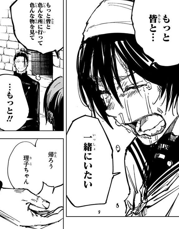 一方、天内理子を連れて高専最下層・薨星宮まで辿り着いた夏油は、天内と話し合い天元との同化を中止することにします。夏油は天内を連れて帰ろうとしますが、そこに五条を殺した伏黒甚爾が追いつき、天内を銃で撃ち殺してしまいます。