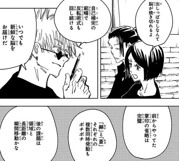 伏黒甚爾は天内の死体を盤星教の代表役員に引き渡し、多額の報酬を受け取ります。しかし、仲介役と別れ一人になった伏黒甚爾の前に殺したはずの五条が現れます。五条は死に際で掴んだ呪力の核心によって、反転術式が使えるようになっていました。五条は反転術式を使って自分自身を治癒、さらに反転術式によって生まれた正のエネルギー、そのエネルギーを無下限の術式に流し込み術式反転「赫」を使用します。