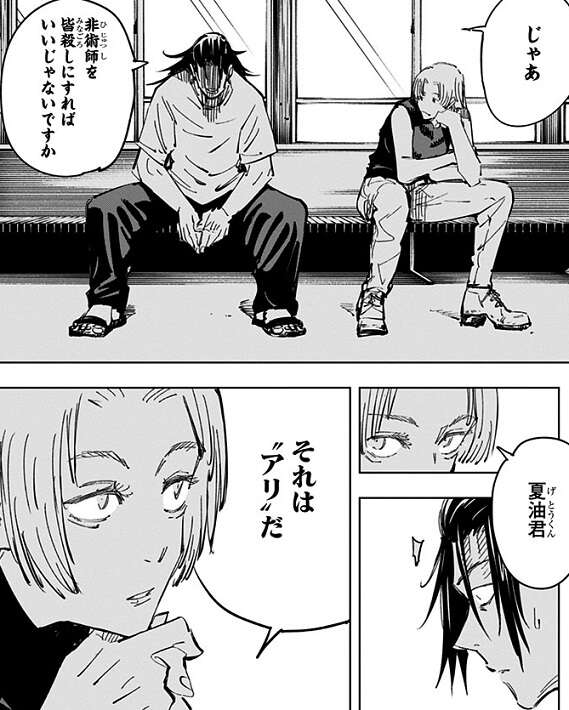 五条は夏油の居場所を家入から聞き、なぜ非術師を大勢殺したか直接、問い詰めます。夏油は、非術師を殺して術師だけの世界を作る、と五条に宣言すると、その場を立ち去ろうとします。五条は立ち去る夏油を追う事も、捕まえる事も出来ず、そのまま見逃してしまいます。