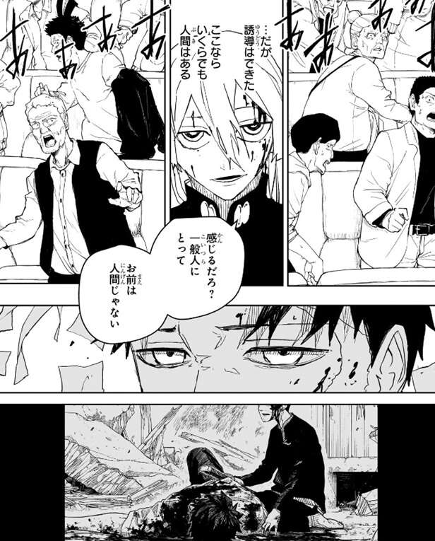 チヒロは丁度、演劇の舞台に着地し、3人の妖術師の死体も落ちてきます。昼彦や多くの観客は妖術師の返り血を浴びた状態になり、観客は何が起きたか分からず茫然とした表情をしています。