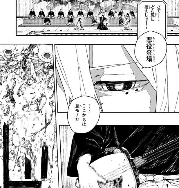 首を斬られた妖術師の生首が丁度、観客の方を見る形で落ちてしまい、観客は悲鳴を上げます。一方、昼彦は雫天石の武器のもう一つの問題点、“一時的”は妖刀との大きな差だと考え、双城は妖刀を時間をかけて慣らした…つまり雫天石の力には一時的では扱いきれない奥行きがある、と分析します。また無傷のチヒロを見て、さすが妖刀三年選手だと褒めます。
