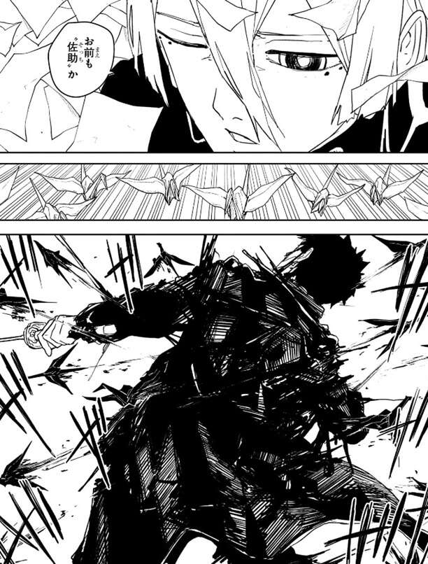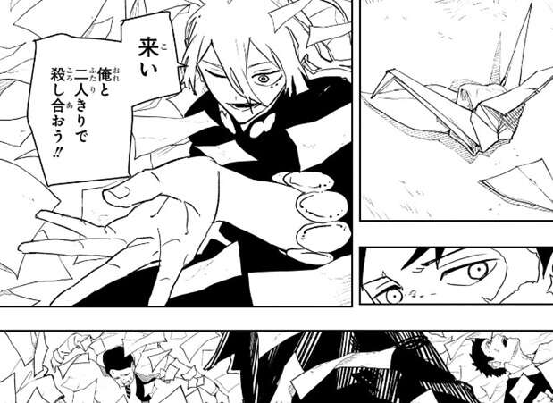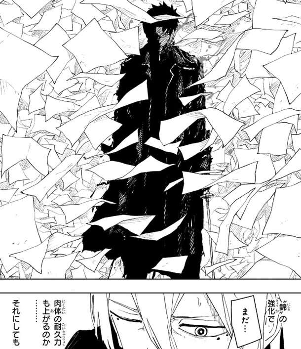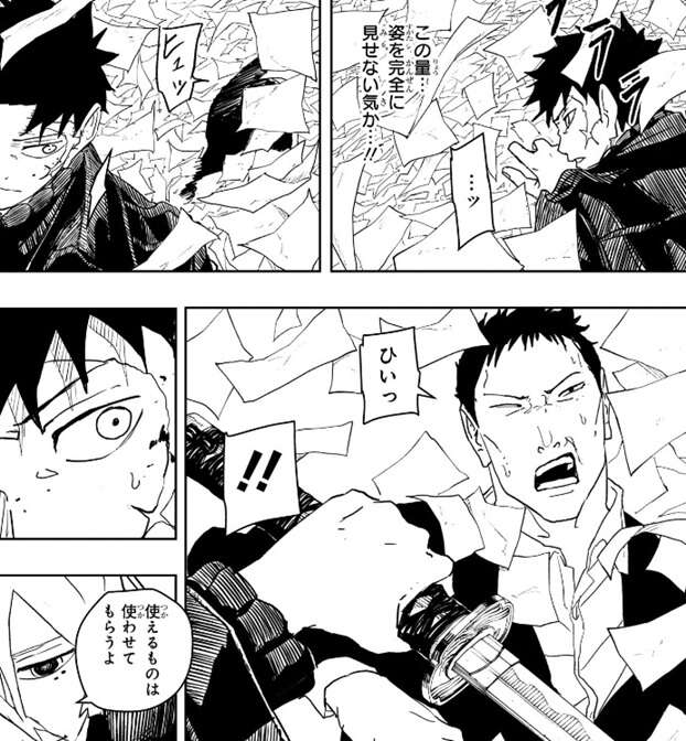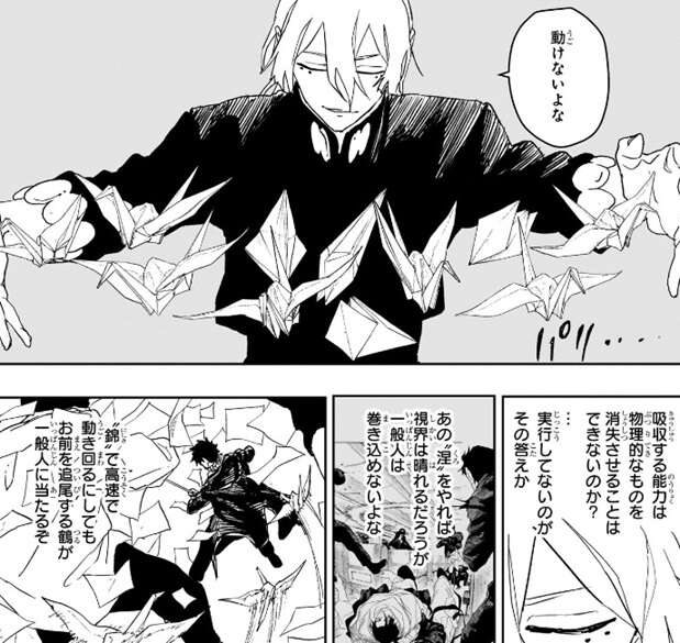 さらに紙を鶴に変えてチヒロを攻撃、鶴は紙で出来ていますが人体を貫くほどの威力でまともに何度も食らうとチヒロでも無事でいられなさそうです。チヒロが観客を気にして動けない様子を昼彦は紙を通じて感知し、チヒロの妖刀の能力を分析します。妖術を吸収する“猩”(あか)がありますが、昼彦は妖術でも物理的なものは消失できないと分析します。さらに衝撃波を放つ“涅”(くろ)なら紙や鶴を一掃し視界は晴れると分析しますが、同時に一般人も巻き込むのでチヒロは使えないと分析します。身体能力を強化する“錦”(にしき)で動き回れば、チヒロを追尾する鶴が一般人に当たってしまうので、やはり昼彦は“錦”も使えないと分析します。