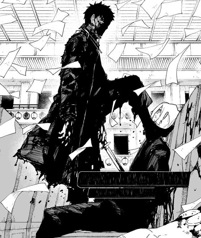 第53話では、演劇の劇場にチヒロを誘い込んだ昼彦は、観客を盾にしながらチヒロを攻撃します。さらにチヒロに観客を殺されて、チヒロに悪側(こっち)である事を実感してもらい、二人きりで殺し合いをしようと昼彦は考えますが、チヒロは観客には犠牲を出さないよう淵天を使う事を途中で止めます。そして、昼彦の鶴の攻撃を誘って全身ボロボロになりながら昼彦の攻撃を受けると、大量の黒い金魚によって空間を満たして昼彦の視界を奪ったようです。何が起こっているか分からない昼彦の腕を淵天で斬って、チヒロは一気に昼彦を追い詰めて形勢は逆転します。