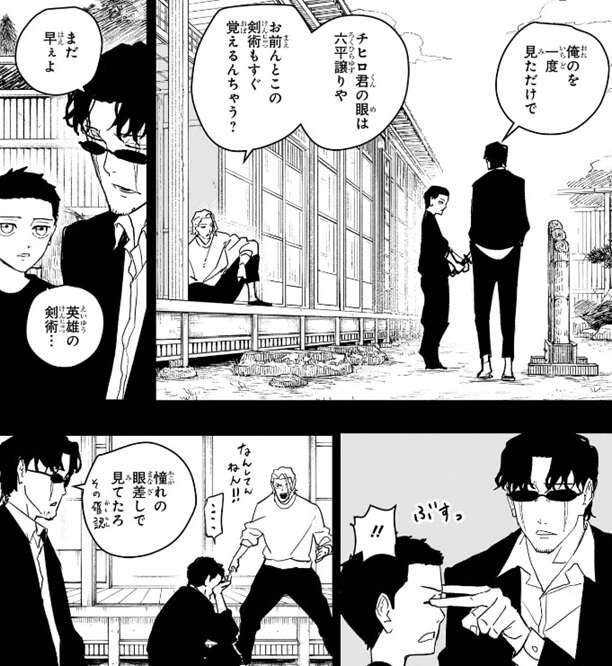 場面はチヒロの回想から始まります。第51話で座村から剣技の手本を見せてもらった14歳の頃のチヒロは、座村の手本を元に並べた藁3本を見事に斬ってみせます。一度座村の剣技を見ただけで斬ってみせたチヒロに、柴はすぐに座村の剣術も覚えると褒めますが、座村はまだ早いと言います。チヒロが英雄の剣術として座村に憧れの眼差しを向けますが、座村はチヒロの目を突いて注意します。座村は、実際の戦闘で斬るのは藁じゃなく人間だぞ、こんなもんに憧れてくれるなよ、俺達は大量に人を殺したんだ、とチヒロに忠告します。ここで回想は終わり、場面は現代に戻ります。