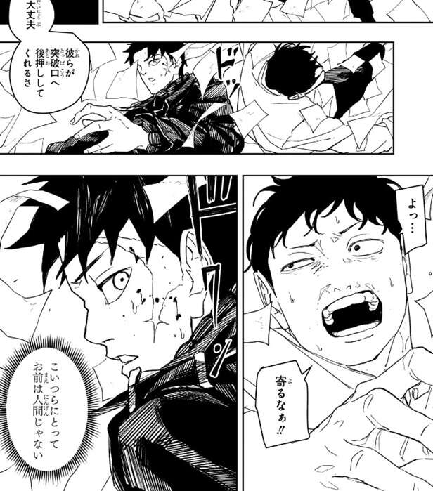 チヒロがその場で昼彦の攻撃を凌ぎ続けようとしても、客がいて淵天を思うように使えず、結局ジリ貧でチヒロは殺されると昼彦は分析しますが、観客がチヒロを突破口へ後押ししてくれるさ、と昼彦はチヒロに言います。つまり、観客を全て殺せばチヒロは自由に動けると言いたいようで、鶴を操って観客をチヒロにぶつけます。観客から寄るな!!と言われ、チヒロは昼彦の、一般人(こいつら)にとってお前は人間じゃない、という言葉が脳裏に浮かびます。