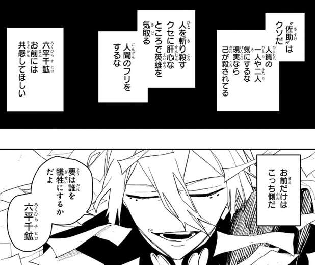 昼彦は今し方中断された演劇の中で敵が人質をとるシーンがあり、その時主人公の“佐助”は身動きが取れず敵を一時逃がすことになるが、この身動きが取れなかった“佐助”はクソだと頭の中でつぶやきます。“佐助”は人を斬り殺すクセに肝心な所で人質を気にして英雄を気取る、人間のフリをするな、と昼彦は頭の中でつぶやき、六平千鉱には共感して欲しいと願います。要は誰を犠牲にするかだよ、六平千鉱、と昼彦は言うと、さらに紙を操ってチヒロに観客をぶつけ、チヒロに観客を殺すように仕向けます。