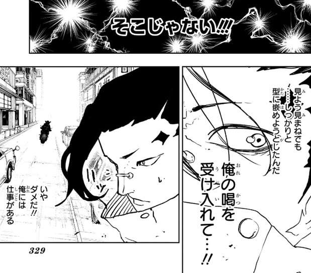 久々李はチヒロの居合を受けて、まだまだ未熟ですが自分の喝を受け入れて、見よう見まねでもしっかりと型に嵌めようとした事に衝撃を受けます。衝撃を受けた久々李は斬欲が膨らみますが、相棒であるもう一人の毘灼を車に放ってきてしまったことあり、イヲリを捕えるという責務を思い出し任務を優先しようと考えます。
