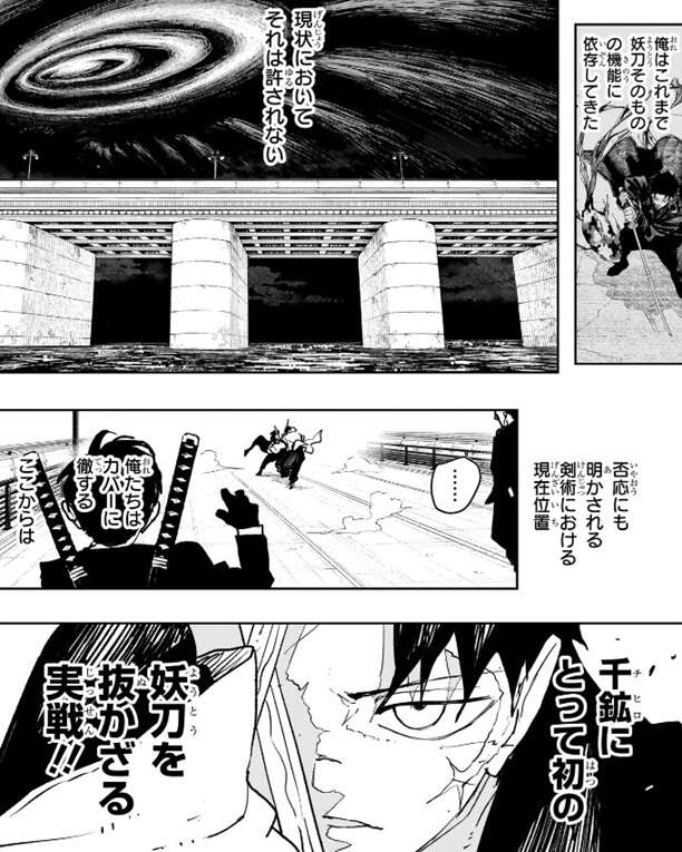 巻墨の隊長・郎から、そりゃ過言だろ、と言われますが、座村と対峙した時に決定的な差があった、それが自分にはない圧倒的な“剣術”だ、とチヒロは言います。斉廷戦争での妖刀契約者は戦前からその道で名をはせていた剣豪達で、妖刀の使用歴で言えばチヒロは3年以上淵天を使っていますが、視えている妖刀の奥行は斉廷戦争時の妖刀契約者の方が明らかに上だとチヒロは言います。チヒロの話を聞き、剣術を極める事が、妖刀使いとしても一段階上へ登るために必要だと、と郎はチヒロの考えを代弁します。