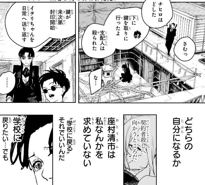 井倉の覚悟を聞いたチヒロは封印に必要な鍵を渡すと、それを屋上へ持っていきサングラスをかけた子供の人に渡すように言います。チヒロはイヲリが今何者でいればいいのか揺れている事に気付いていて、誰かが手を引いてやれるとすれば、井倉かもしれないと考え鍵を渡します。