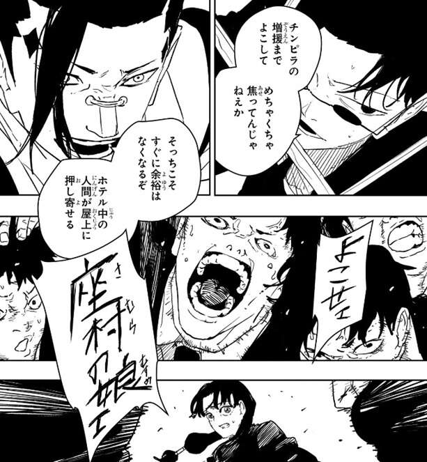 さらに京都殺戮ホテルにいた宿泊客も多数屋上に上がってきます。毘灼側の人間の妖術で宿泊客達は洗脳されているのか、仙沓寺の時と同様、抑制のタガが外れたように、座村の娘をよこせ、と叫びながらイヲリに襲い掛かってきます。