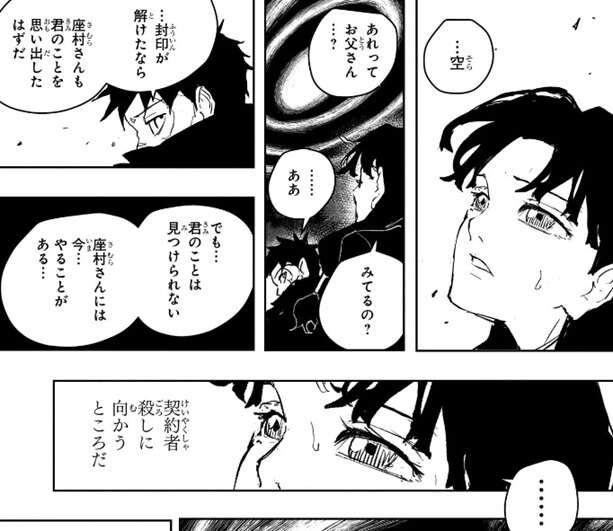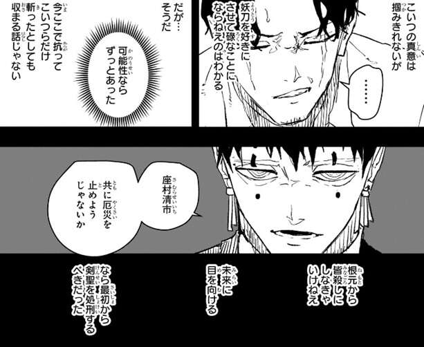 さらに幽は真打と剣聖はかつて想像を大きく超えた事を指摘、安定が続くはずなんて見込みはいつだって超えかねない、可能性ならずっとあったと言い、ぬるい情に甘え真実を隠し生き続けたのは契約者の罪だと言い、命滅契約の仕組みの事を座村に指摘します。幽は、俺の目的は剣聖を処刑し真打を振ることだ、と座村に明かします。“蠱”は剣聖だからこそ引き出せた真打の“本領”だと聞いている、よって俺の目的はむしろ厄災・蠱を止めることに繋がると言います。さらに幽は娘はもういないのかと座村に聞き、未来のために罪を清算するチャンスをやる、と座村に共に厄災を止めようと協力を求めます。座村も幽の真意を掴みきれていませんが、今ここで毘灼や幽を斬ったとしても収まる話じゃない、最初から剣聖を処刑するべきだったと考えるようになります。