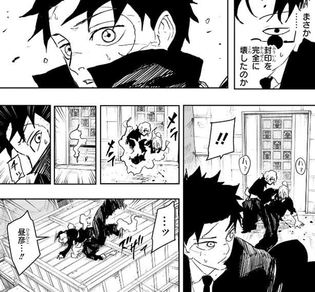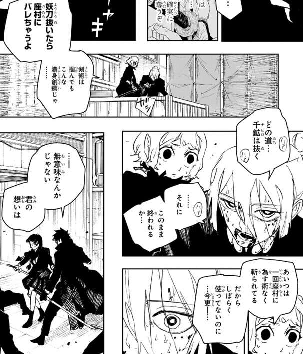 一方、斗斗から酌揺を渡された昼彦は酌揺を抜こうとしますが、妖刀抜いたら座村にバレちゃうよ、と斗斗に言われます。剣術を掴んでもこんな満身創痍じゃ……、と斗斗は昼彦に止めるように言いますが、どの道…千鉱は抜く、と昼彦は言います。しかし、斗斗は千鉱は一度座村に為す術なく斬られている、だからしばらく使ってないのに…今更、と言い、チヒロが淵天を使わないのでは?と昼彦に言います。一方、無意味とつぶやくイヲリに対して、無意味なんかじゃない、とチヒロはイヲリに話しかけます。
