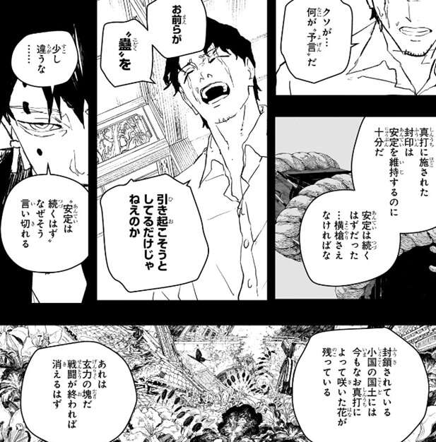 幽は自分達が六平国重を殺したことを明かし、我々の名が“毘灼”だと座村に教えます。さらに契約者も既に一人始末したと座村に教え、これでノルマは達成、毘灼の人員にも限りがあるのでこれ以上は契約者は殺さないと幽は言います。そして、改めて幽は座村に交渉がしたい、改めて未来の話だよ、と言います。座村は真打に施された封印は安定を維持するのに十分だ、安定は続くはずだった…、横やりさえなければな、と幽に言い、毘灼が厄災・蠱(こどく)を引き起こそうとしているだけだと言います。しかし、幽はそれは少し違うと言い、“安定は続くはず”と何故そう言い切れるか、座村に問いかけます。封鎖されている小国の国土に今もなお、真打によって咲いた花が残っているそうで、玄力の塊なので戦闘が終われば消えるはずだと幽は言い、消えていないのは戦後から剣聖の戦意が絶えていない証だと座村に断言します。