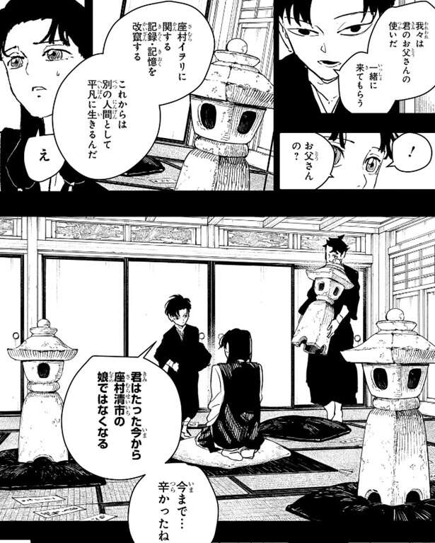 一方、座村イヲリは叔母と暮らし始めて3年ほど経った頃、六平国重の訃報と共にイヲリの生活は神奈備の管理下に置かれるようになります。さらに半年後、巻墨がイヲリの元を訪れて、座村イヲリに関する記録・記憶を改竄する、これからは別の人間として平凡に生きるんだ、とイヲリに伝えます。君はたった今から座村清市の娘でなくなるとイヲリは言われ、今まで…辛かったね、と郎から声をかけられます。