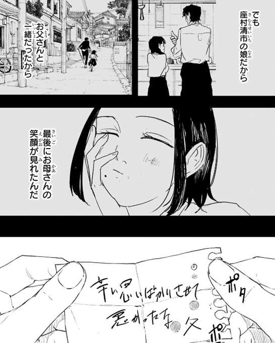 イヲリは複雑な気持ちになりますが、座村清市の娘だから中傷と暴力を受けた、不自由を強いられた、と記録や記憶を改竄するのも仕方がないと考え、別の人間として平凡に生きる事を受け入れます。しかし、座村清市の娘だから、お父さんと一緒だったから最後にお母さんの笑顔が見れたんだ、とも思い悪い事ばかりでなかったと考えるようにします。最後に座村清市から、『辛い思いばかりさせて悪かったな、父』というメモを受け取り、イヲリは涙を流します。