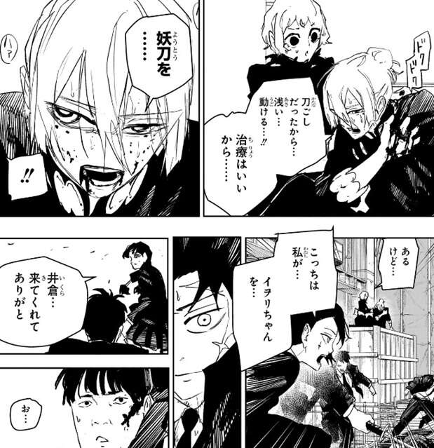 昼彦はチヒロに斬られましたが、刀越しに斬られたようで傷は浅く治療はいいから……妖刀・酌揺を渡すように斗斗に言います。封印を完全に壊し記憶を取り戻したイヲリは、井倉に来てくれたお礼を言うと、再び刀を握ってチヒロと一緒に戦います。