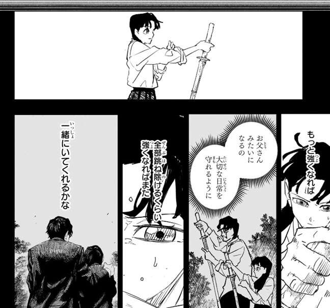 剣術は座村に教わっていましたが、真剣は初めてで目を瞑ったら何とか大丈夫、とイヲリが言うと、さすがにチヒロも驚きます。イヲリは座村清市と離れてからも剣術の練習はずっとしていたようで、もっと強くなれば全部跳ね除けるくらい強くなればまた、座村清市が一緒に入れくれるかな、と考えて練習を続けていたようです。