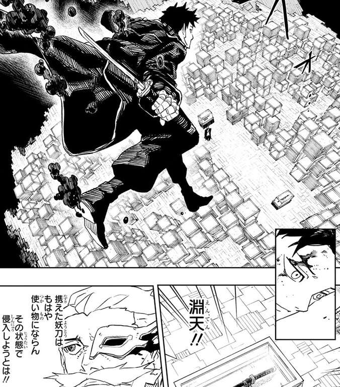 チヒロは刳雲の本領に触れたことにより刳雲は息を吹き返し、鳴・千を発動させ黒い雷を身に纏います。鳴・千を発動させた事で、チヒロは通常を遥かに上回る速度と攻撃力を発揮します。その状態でチヒロは毘灼の統領を攻撃、毘灼の統領の腕を引きちぎります。それでも毘灼の統領はチヒロの攻撃をわざと受けるほど余裕があり、同時に木の壁も深く抉りましたがすぐに修復されてしまい、ハクリと合流が出来ません。