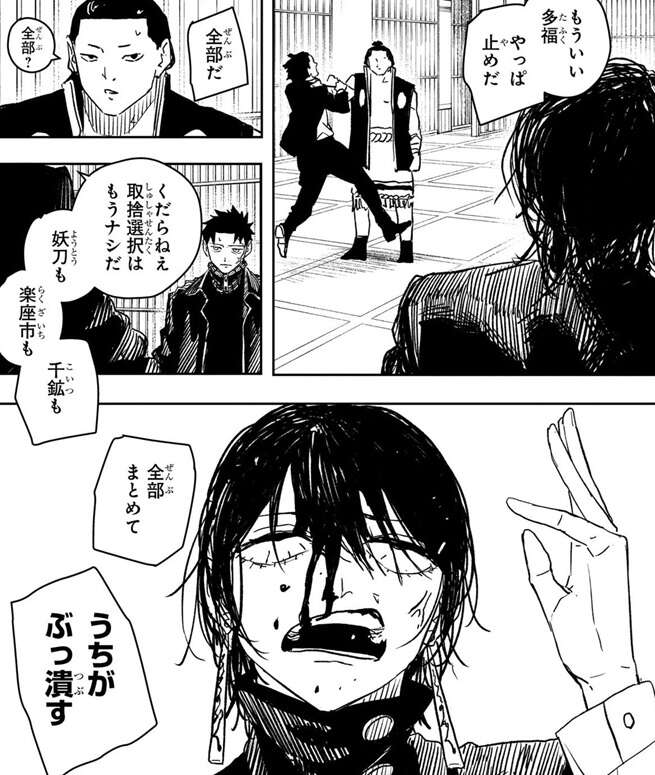 チヒロと緋雪は楽座市の会場にいた警備を次々と倒していき、チヒロと緋雪が近付いた所で田福が結界を張り、結界内の隔離された空間で二人は会話を始めます。緋雪はチヒロを保護すると言いますが、チヒロは楽座市では人も売られている、商品にされた人達を見捨てるのか、と言って緋雪の感情を利用して交渉しようとします。緋雪も神奈備の方針に納得しておらず、チヒロと会話をしている途中でブチギレてしまいます。