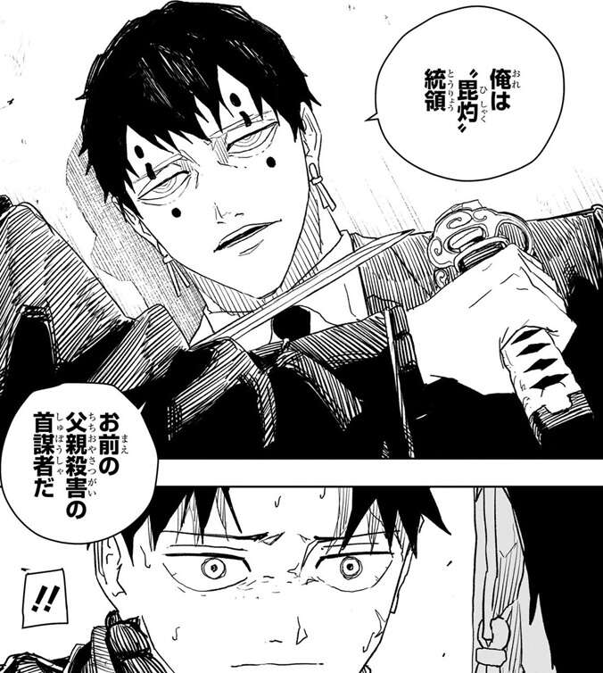 ハクリと合流しようとチヒロは討ち漏らした護衛を倒していきますが、突然木の壁が現れ、ハクリとは分断されてしまいます。さらにチヒロの前に毘灼の男が現れますが、手の甲には特徴のある紋章が刻まれていて、その紋章を見たチヒロは3年前の父・六平国重が殺された時の記憶を思い出します。男は毘灼の統領と名乗り、自らチヒロの父親殺害の首謀者だと明かします。