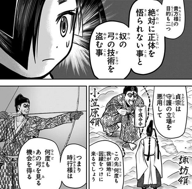 時行は今はまだ逃げ隠れる事しか取り柄がありませんが、頼重は貞宗の弓の技術を盗むことを時行に提案します。果たして貞宗の追及をかわしつつ、時行は貞宗の弓の技術を盗むことが出来るでしょうか?