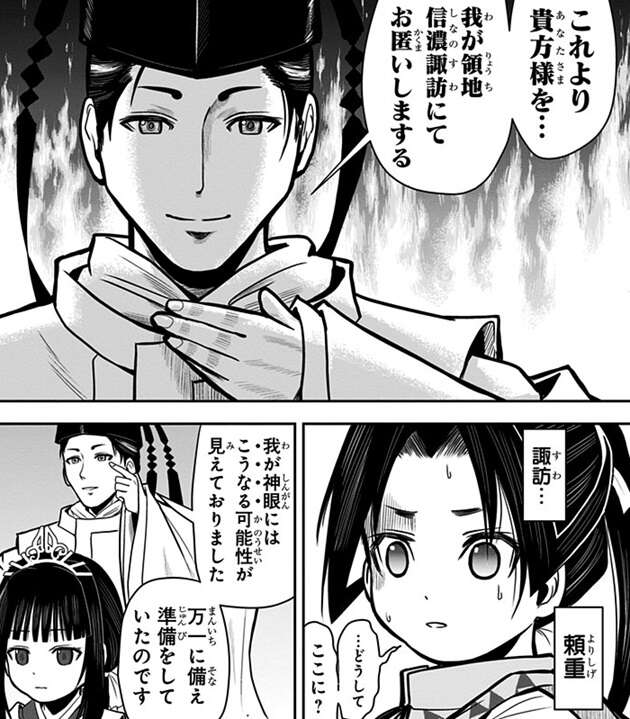 鎌倉が陥落したのを悟ると、北条一族と家臣郎党八百余名は寺に集まり壮絶に自害、時行は故郷と家族をすべて失ってしまいます。茫然とする時行の前に頼重が現れ、これより貴方様を我が領地・信濃諏訪にてお匿いしまする、と時行に言い、時行を匿います。