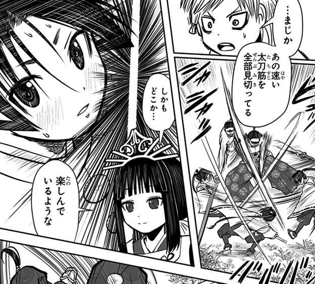 頼重に自分だけの郎党を集めるように言われた時行は、まずは頼重が抜擢した雫、小次郎、亜也子を自分の郎党に加えます。時行達は親睦を深めるために狩りに出かけますが、狩りに出かけた先で巨大なイノシシに襲われます。人肉の味を覚え、人間を狩る事を覚えたイノシシはまさに魔獣で、時行達は手に負えないと逃げようとしますが、執事の雫は巨大なイノシシを倒せると断言します。