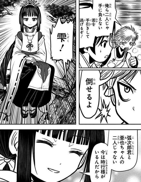 五大院は自分が返り咲くために時行を捕獲すべく、賽の鬼と成り果てて時行を探し始めます。時行は自分から姿を現し弧次郎と亜也子を潜ませて、五大院が自分に近寄ってきた所を弧次郎と亜也子に討たせようとします。五大院は弧次郎や亜也子が背後から襲ってきても冷静に対処し、逆に弧次郎や亜也子を追い詰めます。子供の弧次郎と亜也子では大人の五大院に勝ち目はなく、時行は五大院に斬りかかってこられますが、時行は太刀筋を全て見切ってかわします。