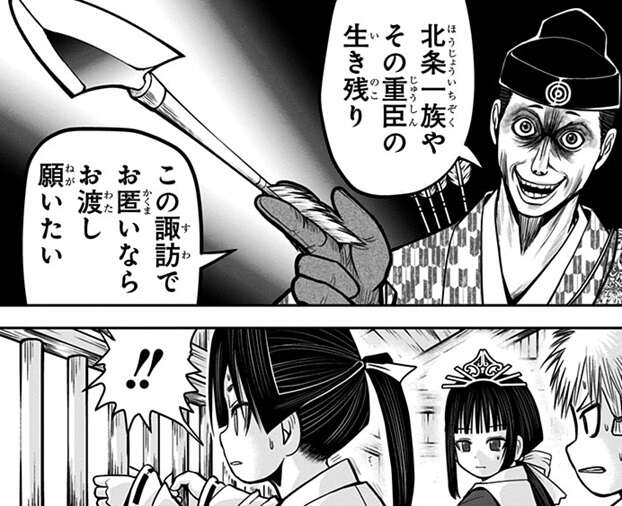 鎌倉を脱出し頼重の領地・諏訪にたどり着いた時行は、頼重から武芸と学問の鍛錬をするように言われますが、頼重を信じきれない時行は毎日鍛錬から逃げ続けます。時行は幼い頃から自分は将来お飾りの王となる定めと思っていたため、今更真剣に何かを学ぶ意義を感じ取れずにいました。そんな時行に頼重は、自分は本物の「神様」だからと神の力を見せようとします。