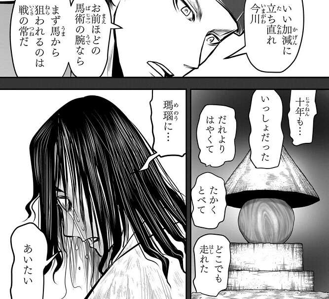 上杉憲顕によって改造された長尾景忠は弧次郎を圧倒しますが、続く保科弥三郎との一対一の太刀打ちで致命傷を負い戦闘不能に陥ります。一方、奥の手を見せようとしている今川範満は愛馬・瑪瑙が亡くなった時の事を思い出していました。瑪瑙をわが生涯の宝石として愛していた今川範満ですが、瑪瑙が戦場で射殺されると心の病を患ってしまい何度も自害しようとしていました。