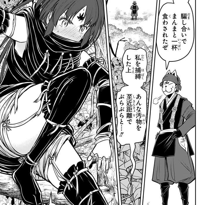 今川に重傷を負わせ競馬レースでも勝った時行は、北条軍の士気を上げる事に成功します。一方、士気が逆転し大敗した足利軍は鎌倉まで撤退します。戦の合間、風間玄葉は捕らえていた天狗衆・夏の四の縄をほどき、時行の下で働くよう説得しますが、隙をついて逃げられてしまいます。