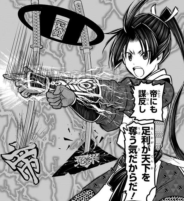 11巻では、北条軍 vs 足利軍の戦いに一区切りがつきます。今川との戦いは、吹雪が講じた作戦が功を奏して、北条軍の士気を上げる事に成功、そのまま小手指ヶ原の戦いに勝利し足利軍は鎌倉まで撤退します。そして北条軍を迎え撃つため、足利軍は大将・足利直義が自ら出陣し指揮を執ります。足利直義の知識と論戦力で時行を論破し、さらに鮮やかな兵法で北条軍を三方向から包囲します。しかし、北条泰家が敵陣の三浦時明と直接交渉する事で、北条軍に寝返り形勢は一気に逆転します。敗北した足利軍は鎌倉から撤退しますが、足利直義は密かに淵辺義博に命じて護良親王を暗殺させます。