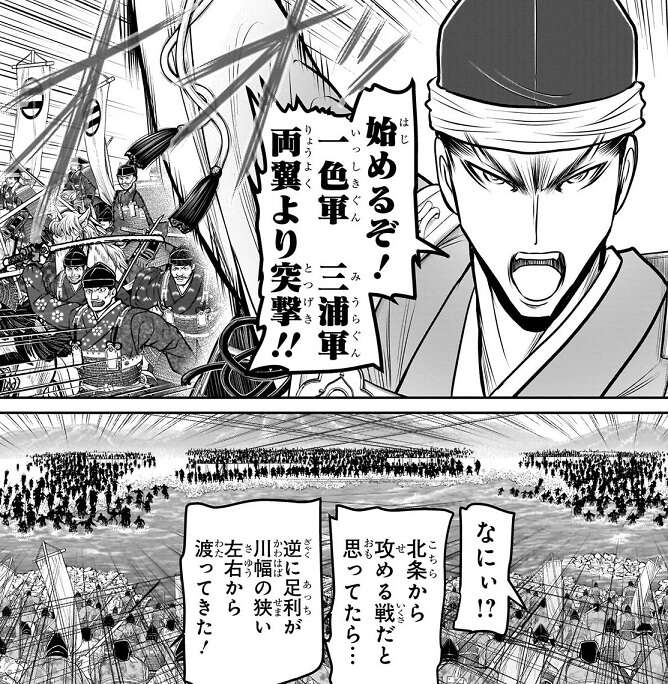 足利直義は別動隊が狼煙を上げたのを確認すると、時行との論戦を止めて自陣へと戻ります。途中まで時行と会話をしながら自陣へと戻っていきますが、会話の途中で足利軍の別動隊が北条軍の後方から奇襲を仕掛けて、そのまま本陣の背後へと迫っていきます。時行は奇襲を狙っていた足利直義に、ずるい!!と、文句を言いますが、足利軍は背弧の奇襲だけでなく前方の両翼からも突撃を仕掛け、北条軍を三方向から攻め立てます。