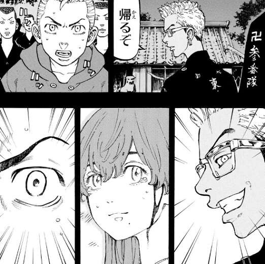 新参番隊隊長の任命式も終わろうとしていた時、武道は思わず稀咲を殴ってしまいます。未来でヒナが殺された記憶が蘇ってしまい、たまらず手が出てしまいました。そこにさらにマイキーの幼馴染の場地も乱入して来て現場は大混乱です。